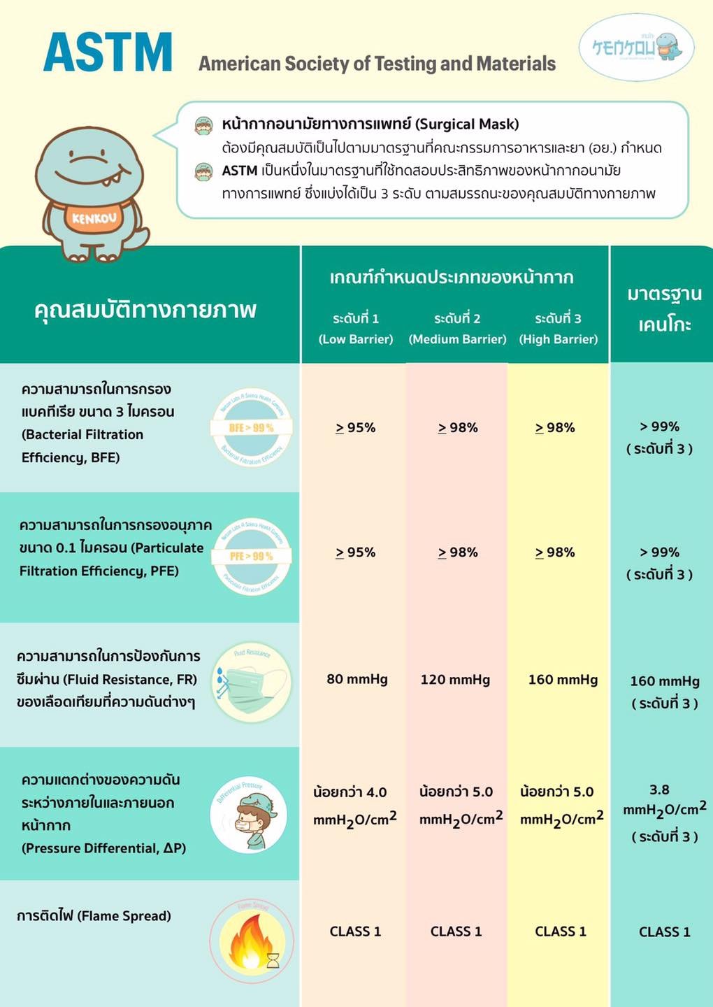 หน้ากากอนามัยที่ใช้ทางการแพทย์ต้องมีคุณสมบัติเป็นไปตามมาตรฐานที่คณะกรรมการอาหารและยา (อย.) กำหนดไว้ ซึ่งจะมีความสอดคล้องตามมาตรฐานผลิตภัณฑ์อุตสาหกรรม กระทรวงอุตสาหกรรม และสามารถเทียบเคียงได้กับมาตรฐานสากล เช่น มาตรฐาน American Society of Testing and Materials (ASTM) ซึ่งตรวจสอบโดยหน่วยงานสถาบันอาชีวอนามัยและความปลอดภัยของประเทศสหรัฐอเมริกา (The National Institute for Occupational Safety and Health, NIOSH) โดยจะแบ่งเป็นหน้ากากทางการแพทย์ (Surgical mask) เป็น 3 ระดับ คือ Low Barrier, Medium Barrier และ High Barrier ตามคุณสมบัติทางกายภาพของหน้ากากอนามัย ดังนี้